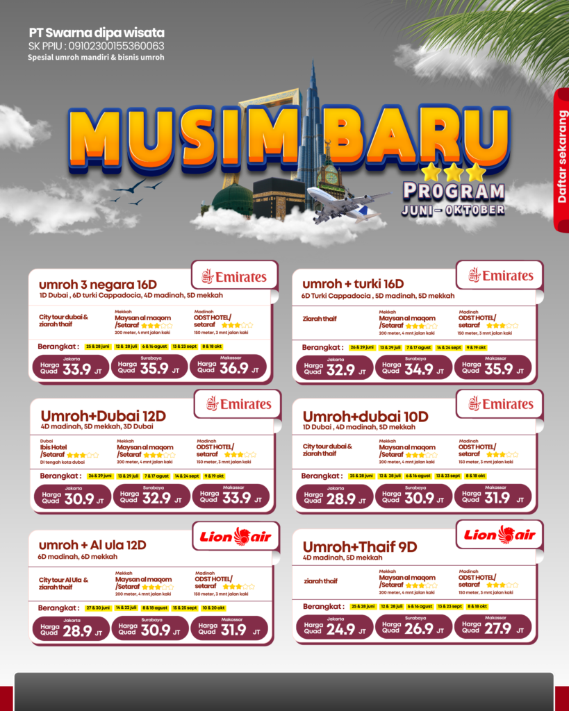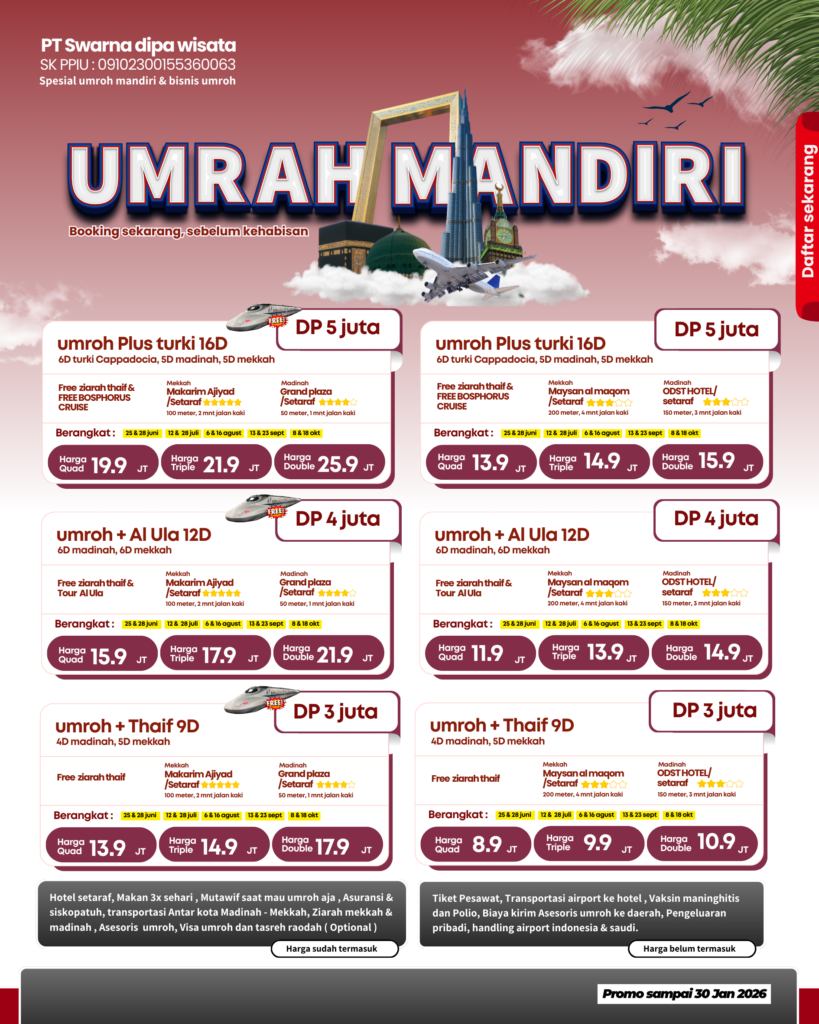 Umroh Mandiri merupakan suatu program untuk membantu kamu agar bisa umroh dengan budget terbatas, namun tetap bisa beribadah dengan nyaman. Cukup cari dan beli tiket pesawat susuai tanggal keinginanmu dan sisa nya serahkan sama AL HIDAYAH WISATA untuk membantu mu!
